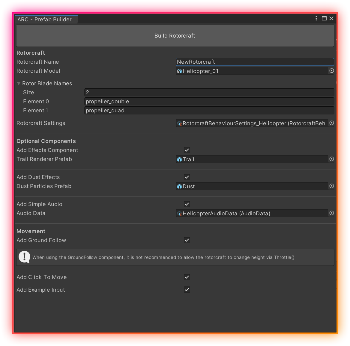 Prefab Builder - Link - ARC comes with a handy 'Prefab Builder' to help you quickly put together a working, controllable, flying rotorcraft vehicle (helicopter, drone, etc). Assign the model, fill out a few details, press build and be piloting your new vehicle around in seconds!