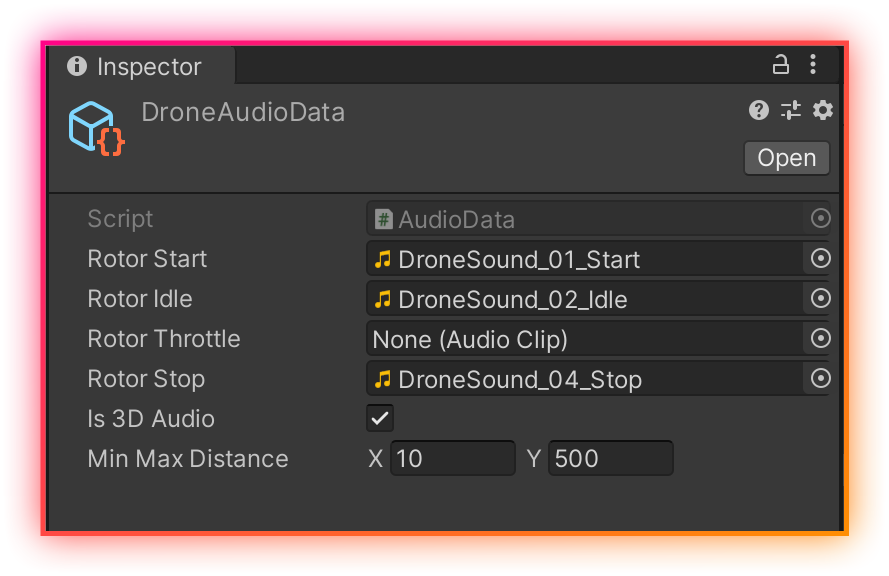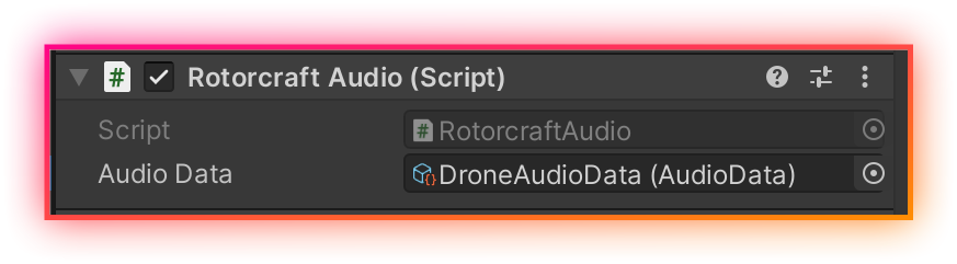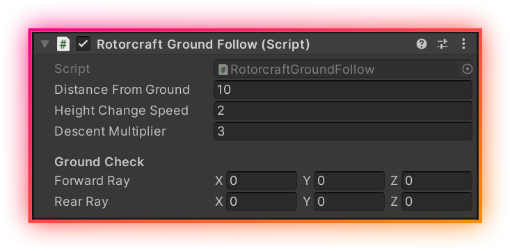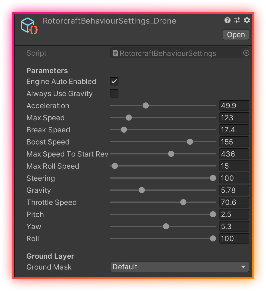 Rotorcraft Settings - Link - All the settings for a rotorcraft behaviour are stored on Scriptable Objects, for ease - allowing you to reuse and update settings across multiple flying vehicles.