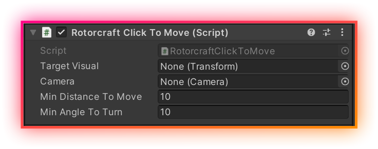 Click to Move - Link - The Click To Move component is for games with a top down view and mouse controls, allowing you to click a location on the map to set a target position, and then the rotorcraft will make its way to that target position.