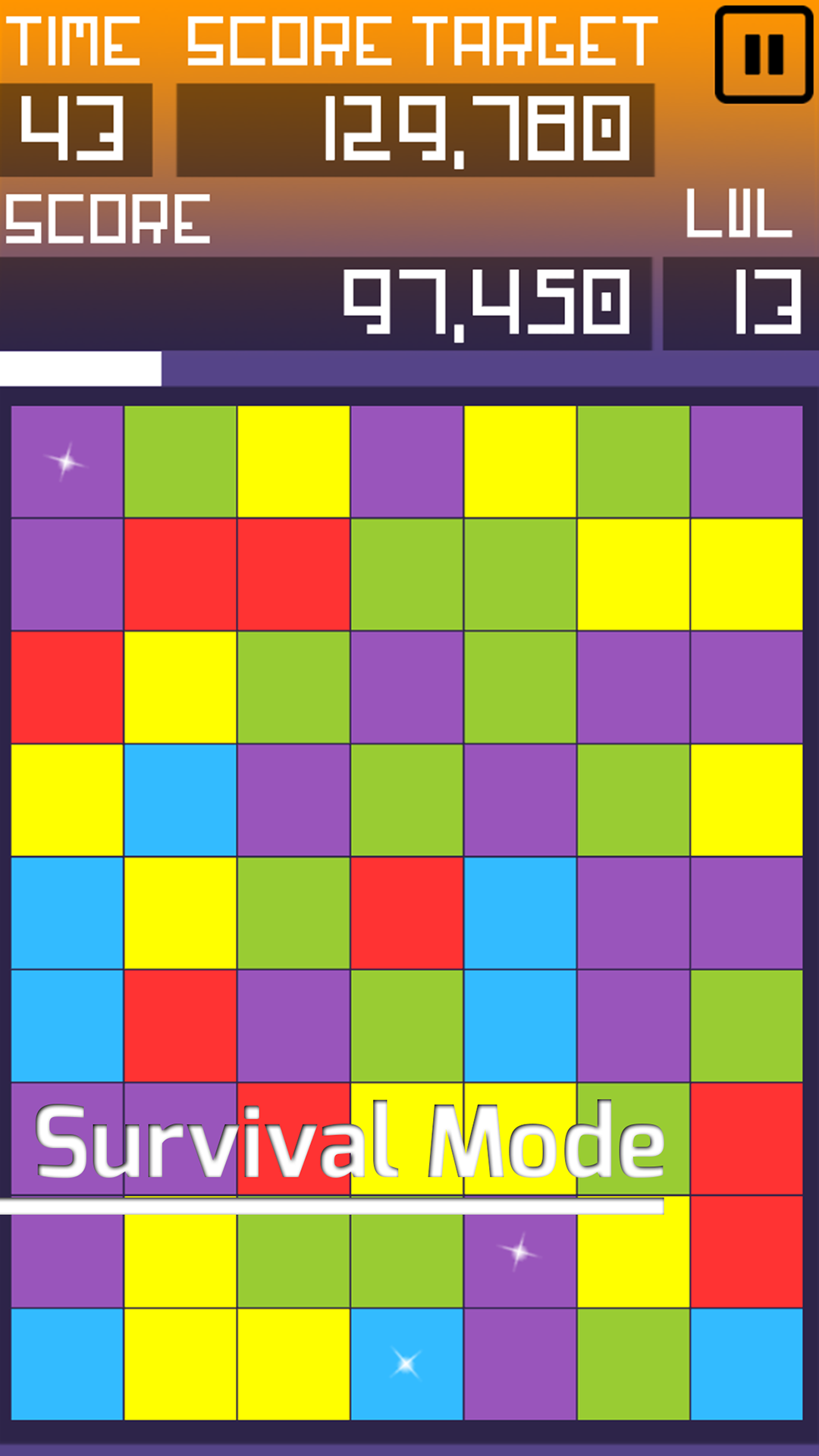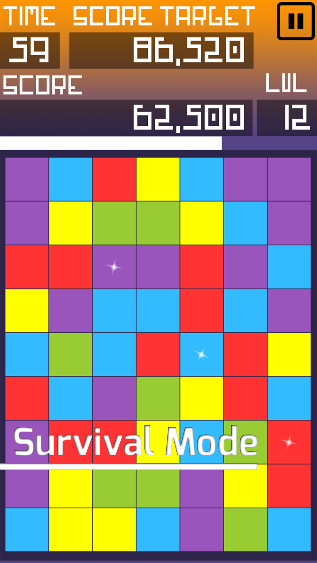 Survival mode starts the player off with 60 seconds on the clock, and a target score to reach. Once the target is reached, additional time is rewarded and a higher target is given.