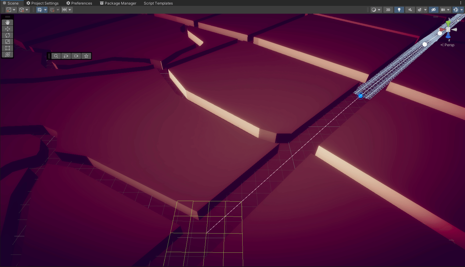 During whiteboxing/ prototyping I tested a spline system for laying the roads.